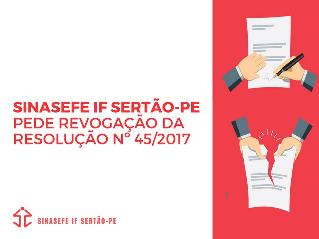 De acordo com o diretor de Coordenação Geral do Sinasefe IF Sertão-PE, Juciel Lima, a Resolução n° 45/2017 traz item não previsto em lei e conteúdo incompleto, tolhe a movimentação do servidor e recai em constrangimento ilegal. “Os atos administrativos em torno da Resolução em questão são inconstitucionais, arbitrários e lesam os servidores. A forma e seu conteúdo ferem os princípios da legalidade e publicidade, impessoalidade, moralidade e eficiência. O Sinasefe IF Sertão-PE espera que a Gestão reconheça os fatos e através da via do diálogo revogue a Resolução”, afirmou ele.
