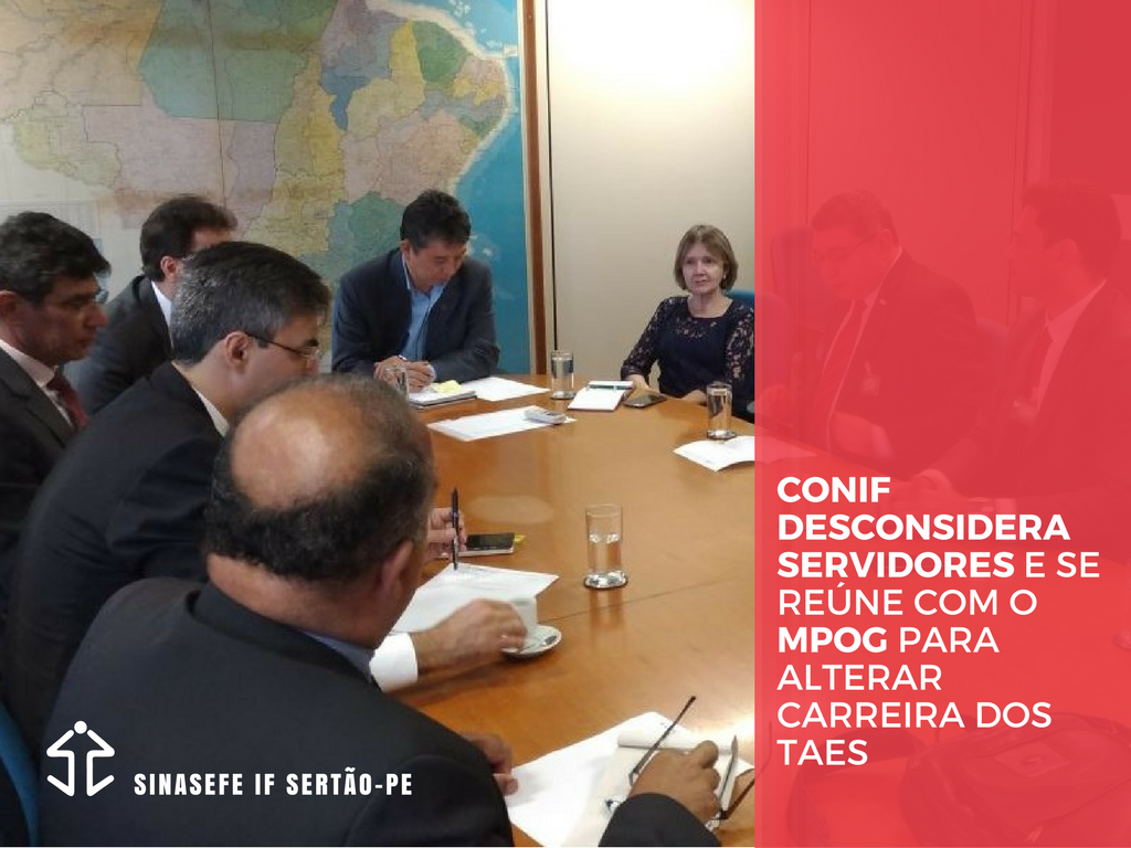 Sem nenhum comunicado à Comissão Nacional de Supervisão da Carreira dos TAES (CNS), o Conselho Nacional das Instituições da Rede Federal de Educação Profissional, Científica e Tecnológica (Conif) e o Ministério do Planejamento (Mpog) se reuniram, no dia 24 de janeiro, em Brasília, para discutir, entre outros temas, mudanças no Plano de Carreira dos Cargos Técnico-Administrativo em Educação (PCCTAE).